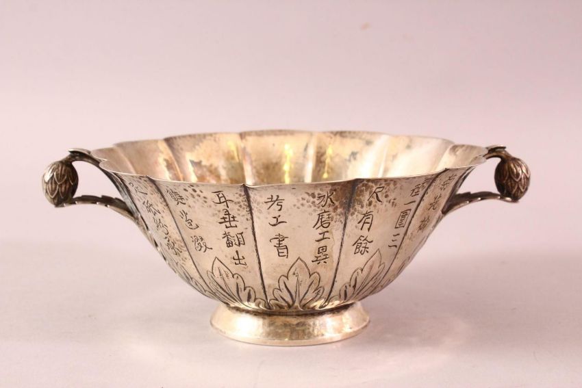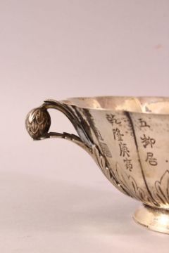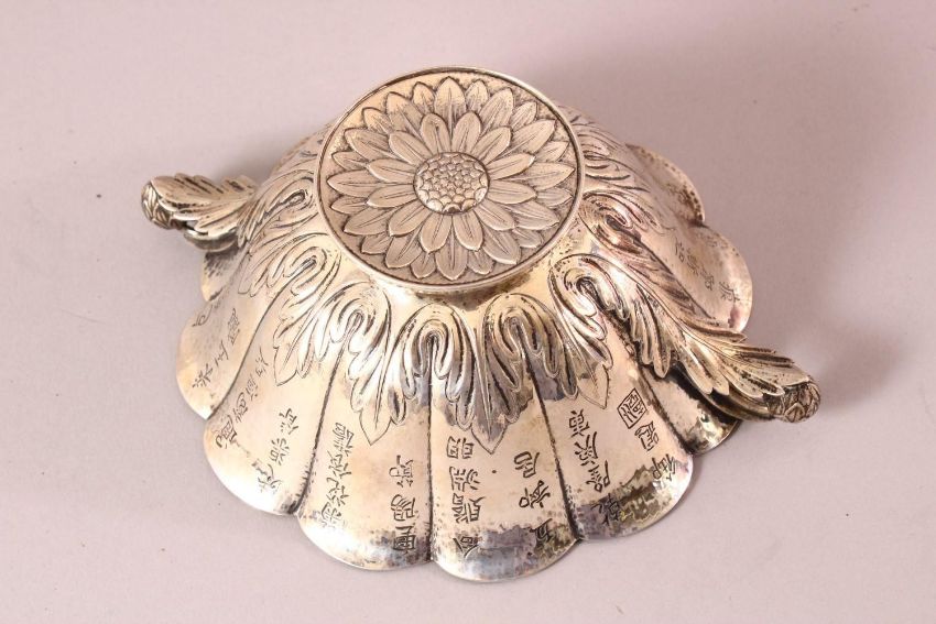 A STERLING SILVER CHINESE 19TH / 20TH CENTURY COPY OF A QIANLONG BOWL, the famous chrysanthemum formed bowl with leaf and acorn handle, the base as a chrysanthemum, the foot rim marked for sterling with a hallmar, also " reproduction of antique " 21cm wide.