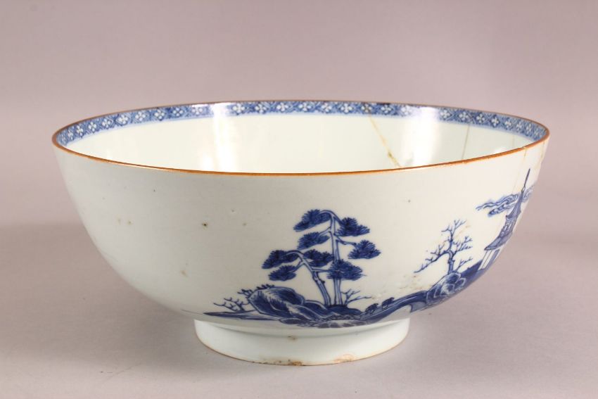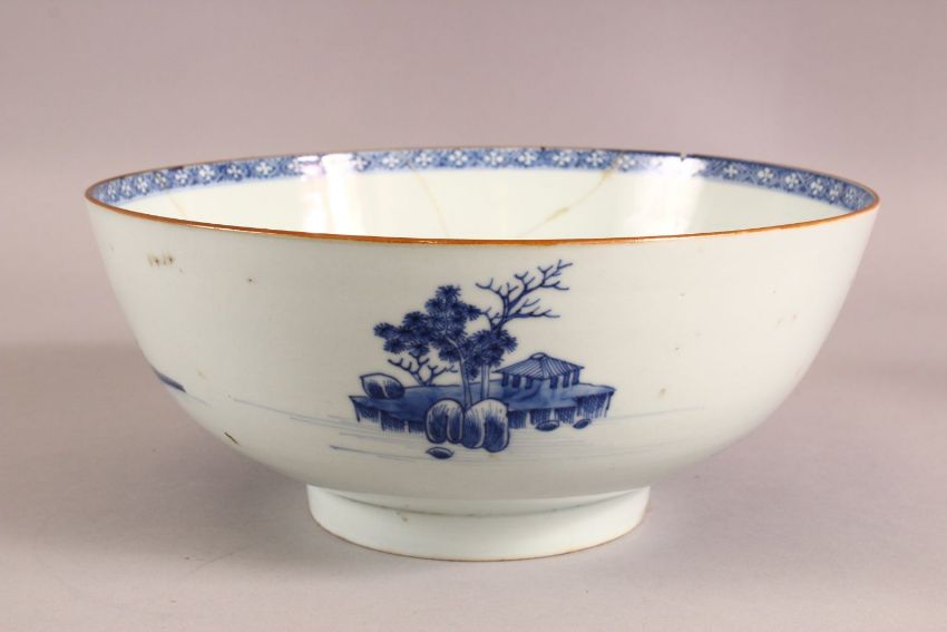 A CHINESE BLUE AND WHITE CIRCULAR BOWL, the outer painted with a landscape setting and temples, (AF), 26cm diameter.