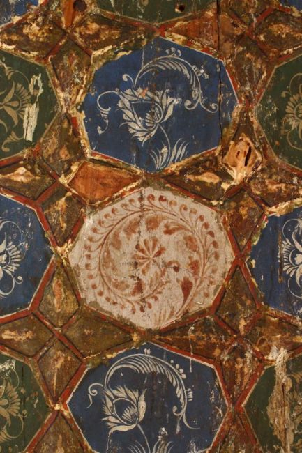 A LARGE 17TH / 18TH CENTURY PERSIAN WOODEN PANEL, with moulded star decoration with painted flora, 106cm x 38cm.