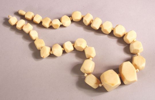 AN IVORY BEAD NECKLACE, comprising 26 facet beads, largest 33mm wide, 46cm long. Weight 108g.