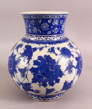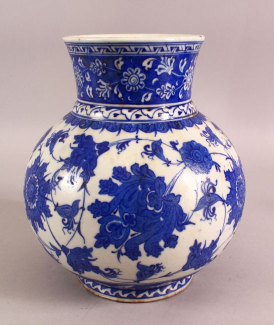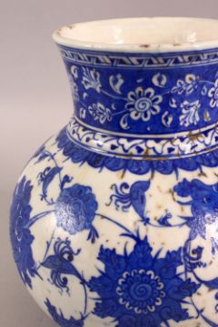 AN 18TH CENTURY BLUE & WHITE POTTERY VASE - decorated with scrolling floral roundel - 26cm