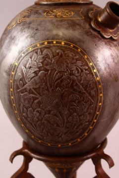 A GOOD 19TH CENTURY PERSIAN QAJAR INLAID STEEL HUQQA BASE & STAND, with carved birds and floral decoration with gold coloured decoration, with a tripod base, overall 28cm