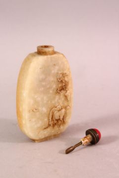 A CHINESE CARVED WHITE JADE SNUFF BOTTLE, carved with a dragon and horses, 8.5cm high