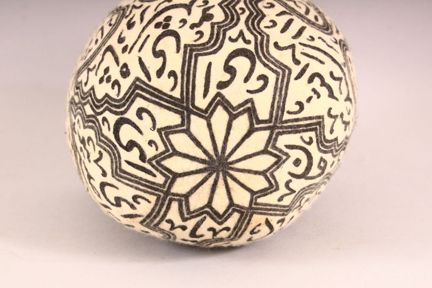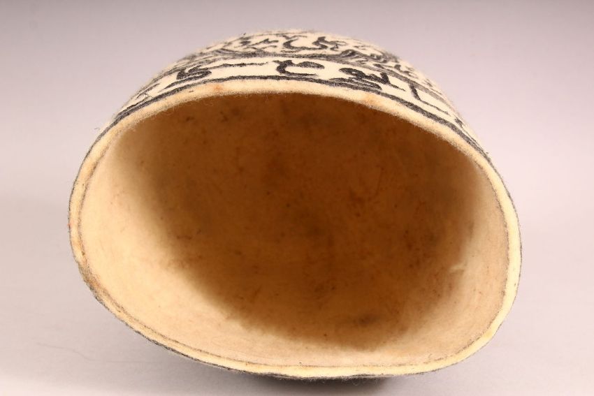 AN ISLAMIC FABRIC CALLIGRAPHIC HEAD PIECE / HAT - with a beige ground and black calligraphy and decoration,