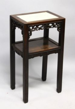 A GOOD LATE 19TH CENTURY CHINESE HARDWOOD TWO TIER STAND, the top inset with a marble panel above a carved frieze, 80cm high, 43cm wide, 32cm deep.