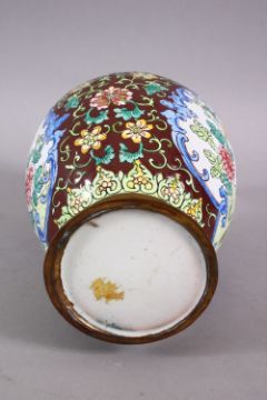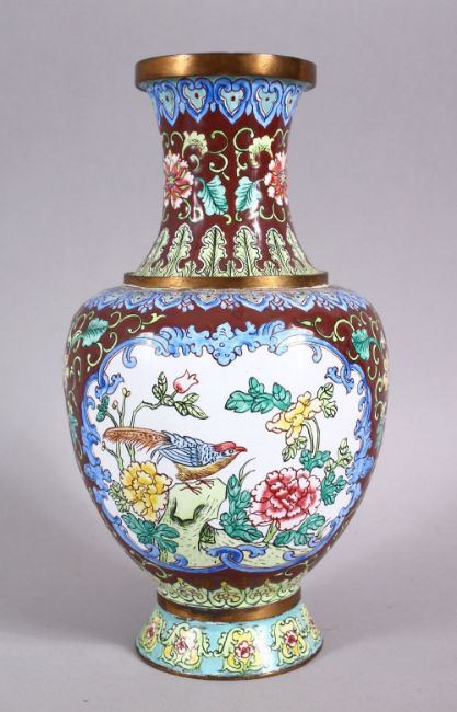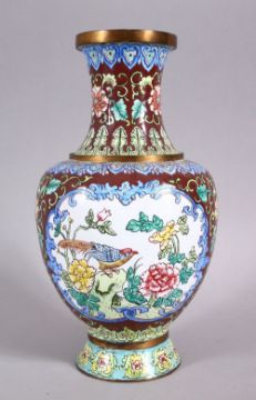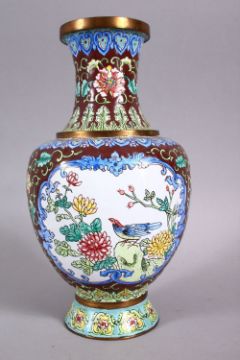 A GOOD 20TH CENTURY CHINESE ENAMEL VASE - ith a cafe au lait ground and panels of birds amongst flora, with lappet borders, 23cm high .