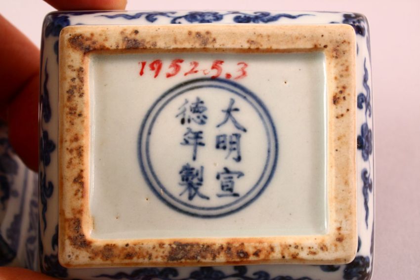A CHINESE MING STYLE BLUE & WHITE PORCELAIN BOX & COVER - decorated with flora, base with a six character mark, 8cm