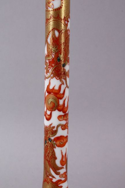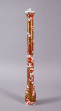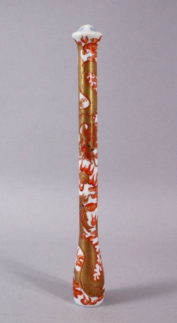 A CHINESE IRON RED & GILT DRAGON PORCELAIN PEN HOLDER OR PIPE , the body decorated with dragons and clouds, the top with a four character mark. 22cm.