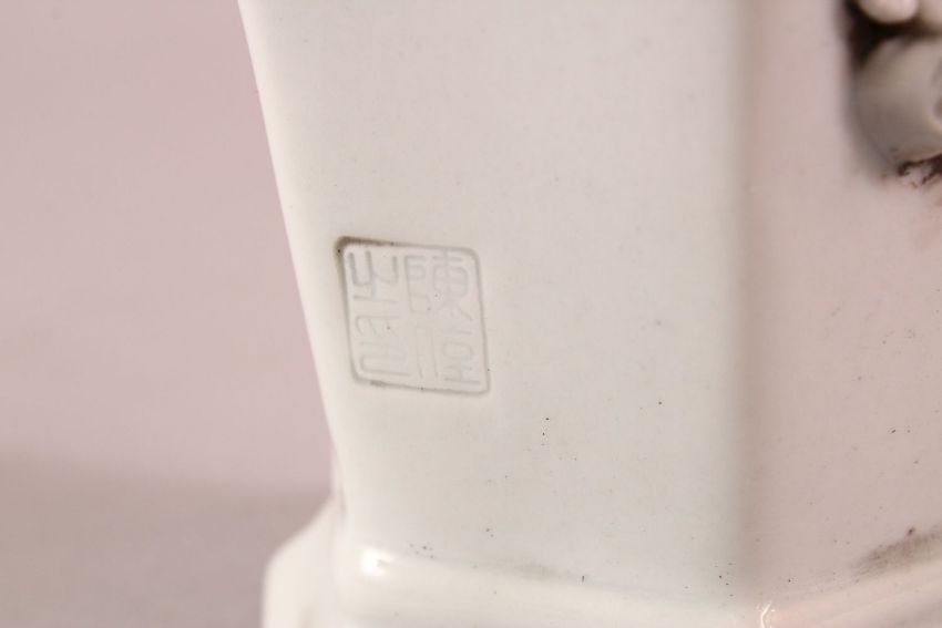 A CHINESE BLANC DE CHINE / DEHUA CARVED TWIN HANDLE PORCELAIN VASE - with raised floral decoration and twin handles - the base 25cm