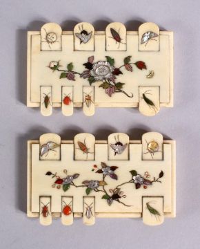 A PAIR OF JAPANESE MEIJI PERIOD SHIBAYAMA IVORY GAMES COUNTERS, each inlaid with semi precious stones / shells to depict native flora and insects, 9cm x 6cm