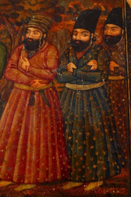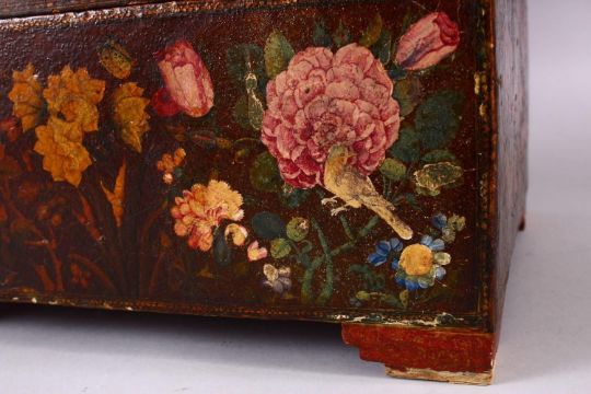 A GOOD PERSIAN QAJAR LACQUER PAINTED LIDDED BOX, decorated to the exterior with birds and detailed sprays of native flora, the lid decorated with gold spray and flora with a central painting depicting figures with gifts to a noble figure, the underside of the lid again finely painted with a panel depicting noblemen upon horseback attacking tigers, 28cm x 42cm x 28cm deep.
