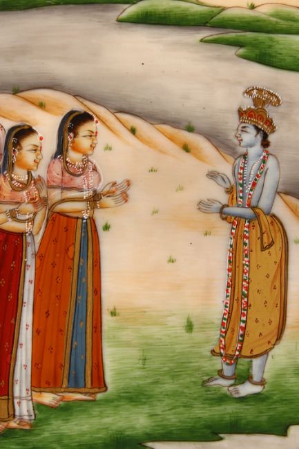 A FINE INDIAN IVORY MINIATURE PAINTING OF KRISHNA AND GOPIES, 15cm x 10.5cm.