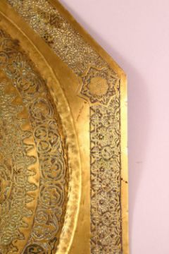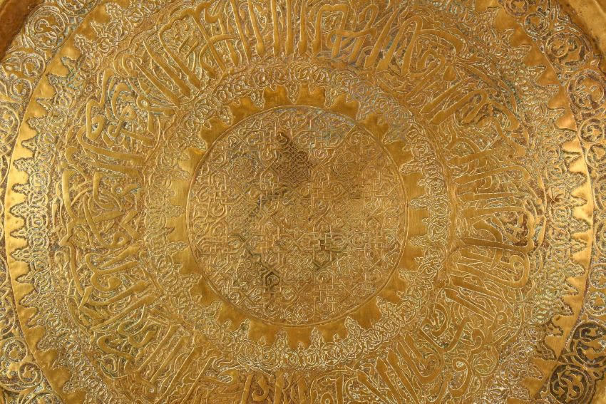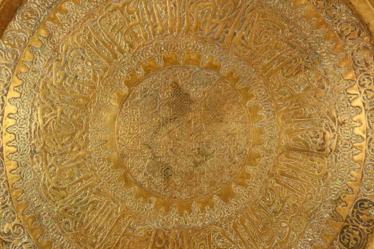A LARGE ISLAMIC BRASS CALLIGRAPHIC CHARGER, the body carved with calligraphy with foliate decoration, 67cm