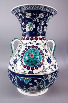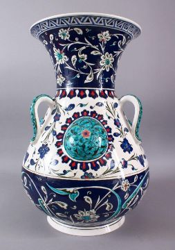 A LARGE TURKISH OTTOMAN STYLE CERAMIC FLORAL LAMP VASE, with three moulded handles and three bosses, decorated with bands of stylized scrolling floral motif, 48cm x 34cm.