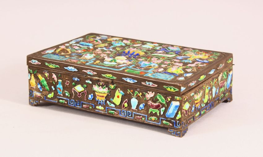 A CHINESE WHITE METAL & ENAMEL LIDDED BOX - the box with raised enamel decoration depicting precious object and flora, the base marked "China" 5cm x 17cm