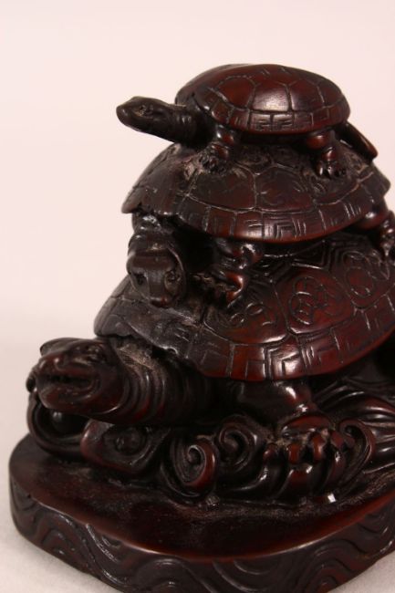 A CHINESE CARVED / MOULDED FIGURE OF THREE TURTLES AMONGST WAVES - 10cm