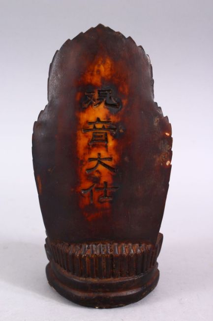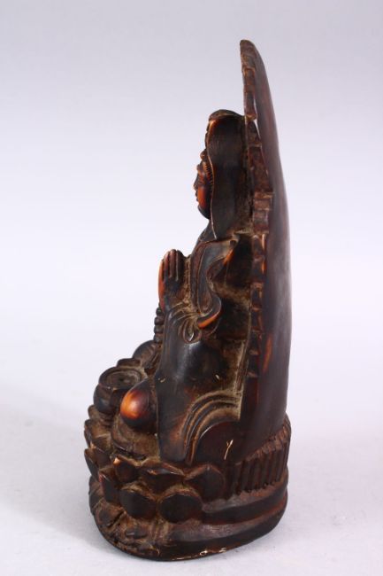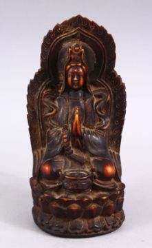 A GOOD CHINESE CARVED IVORY STYLE FIGURE OF SEATED GUANYIN, seated upon a lotus base, with her hands in prayer with a vessel before her, the back carved with calligraphy, 20cm high.