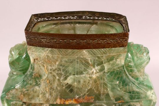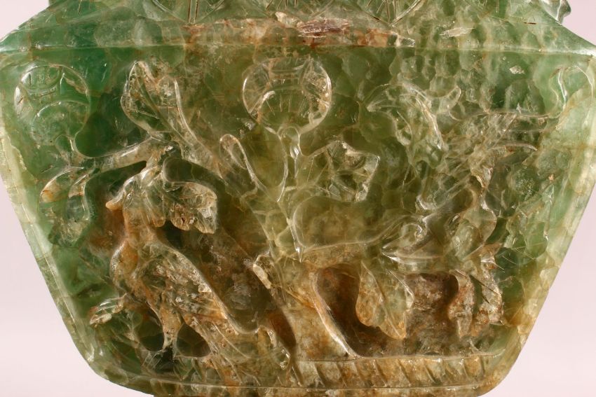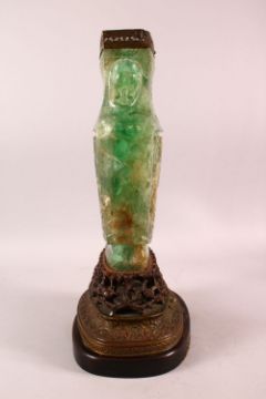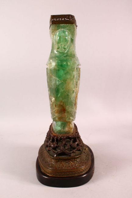 A LARGE AND IMPRESSIVE CHINESE CARVED GREEN QUARTZ VASE / LAMP, on a carved hardwood peach formed stand with metal mounts, the body carved with phoenix and branches, 48cm high x 30cm