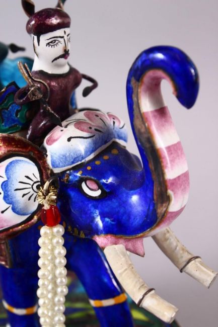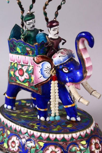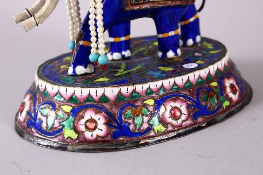 A 19TH / 20TH CENTURY INDIAN SILVER & ENAMEL MODEL OF AN ELEPHANT AND FIGURES, the elephant carrying two figures, with floral decoration, the base marked for silver, 20cm high x 14cm wide.