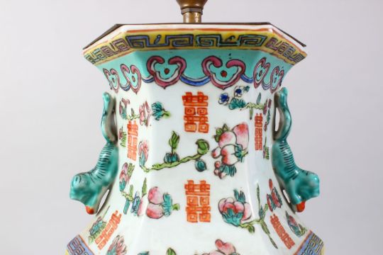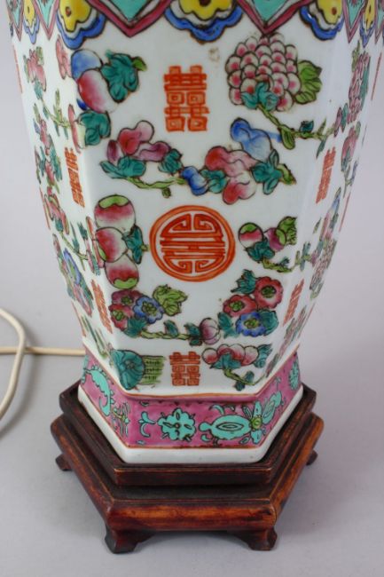 A 19TH / 20TH CENTURY CHINESE FAMILLE ROSE PORCELAIN VASE / LAMP, the body of the vase decorated with scenes of fruit and good luck symbols, with band of ruyi and lappet style borders, with twin moulded handles, sat upon a hardwood carved base, and coupled with its shade. 63cm high x 18cm wide