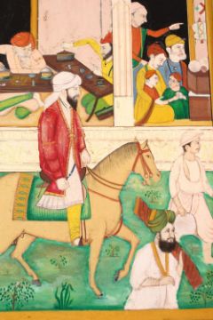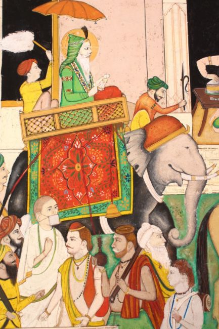 A FINE LARGE INDIAN MINIATURE PAINTING OF SIKH MAHARAJA RANJIT SINGH seated on elephant with in a procession with figures and attendants, 34cm x 29cm.