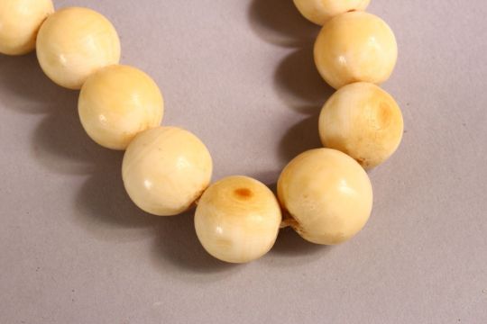 AN IVORY BEAD NECKLACE, comprising 24 spherical beads, largest bead 15mm wide, overall 42cm long. Weight 125g.