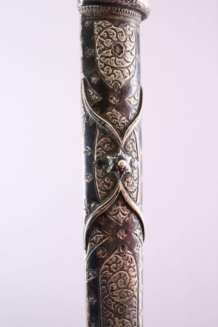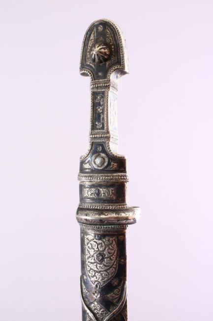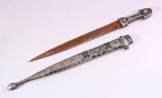 A 19TH CENTURY RUSSIAN KINJAL DAGGER with niello decoration to the scabbard and hilt, 50cm long.