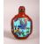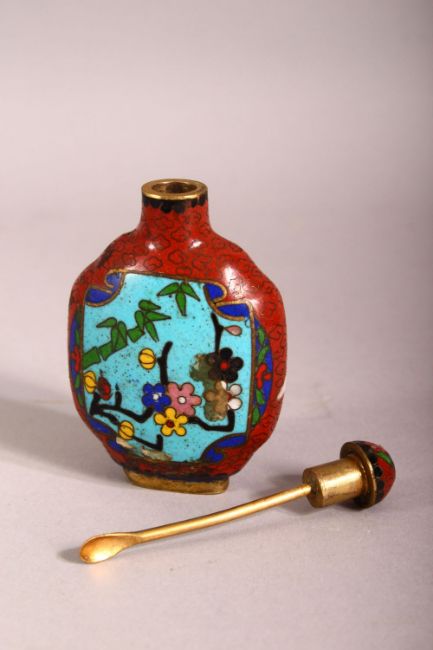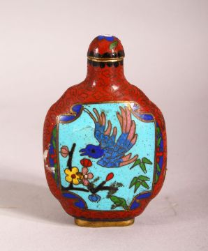 A CHINESE CLOISONNE SNUFF BOTTLE - decorated with a red ground and wire clouds with two panels of flora and birds, 7.8cm