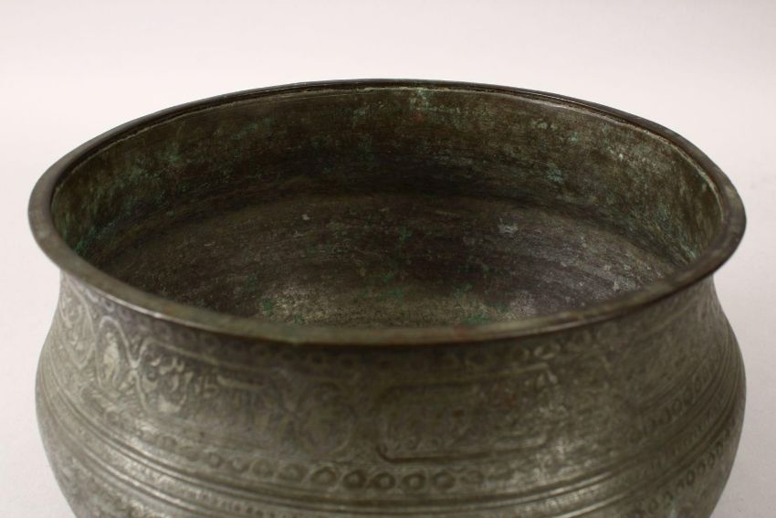 A LATE 19TH CENTURY PERSIAN COPPER CALLIGRAPHIC BOWL , with panel decoration of calligraphy, formal flora and animals, 16cm high x 26.5cm diameter,