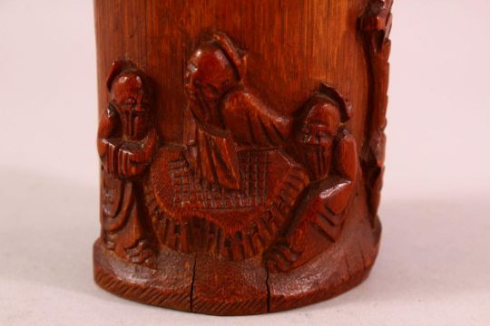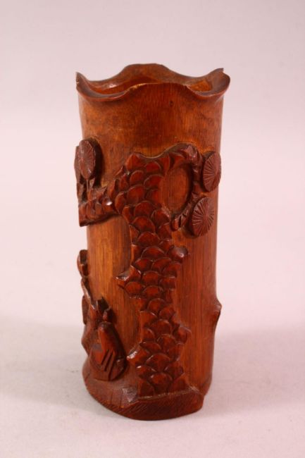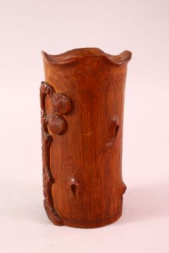 A CHINESE CARVED BAMBOO BRUSH WASH, carved with immortal and pine, 15cm.