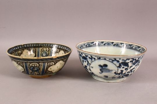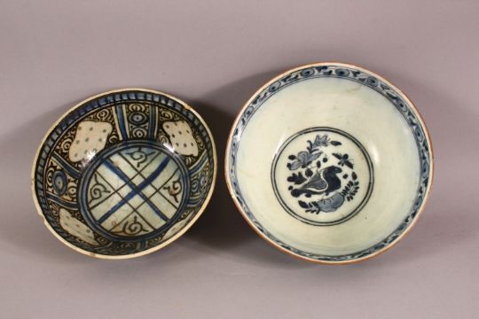 TWO 17TH/18TH CENTURY PERSIAN SAFAVID BLUE AND WHITE GLAZED POTTERY BOWLS, 18.5cm diameter and 17.5cm diameter.