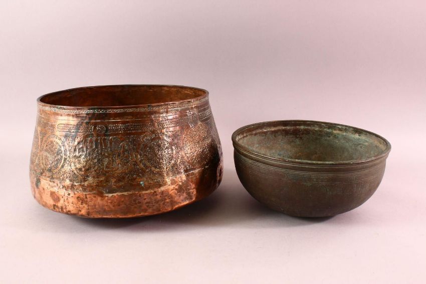 TWO EARLY MAMLUK COPPER BOWLS, each with engraved decoration, 25cm and 28cm diameter.