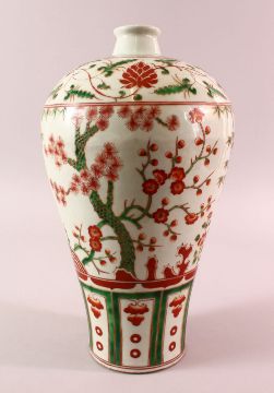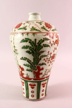 A MING STYLE WUCAI DECORATED PORCELAIN MEIPING VASE - decorated with bamboo and foliage - 32cm.