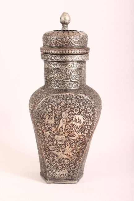 A GOOD PERSIAN TINNED COPPER LIDDED URN - the body carved with figures, animals and flora, with a band of calligraphy to the neck, the lid also with calligraphy, 34.5cm high .