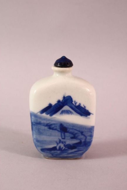 A CHINESE PORCELAIN BLUE AND WHITE SNUFF BOTTLE decorated with landscape, 7cm high.
