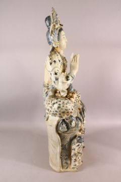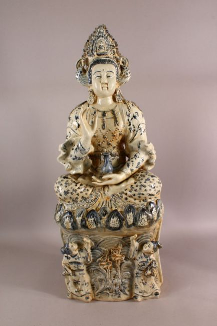 A LARGE CHINESE PORCELAIN FIGURE OF GUANYIN - Seated upon stylized waves with two young attendants, 96cm high