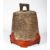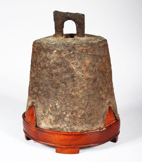 A 15TH / 16TH CENTURY CHINESE CAST IRON TEMPLE BELL, the bell with a slotted knop for hanging, with a later carved hardwood fitted stand, 26cm high x 22cm wide.