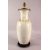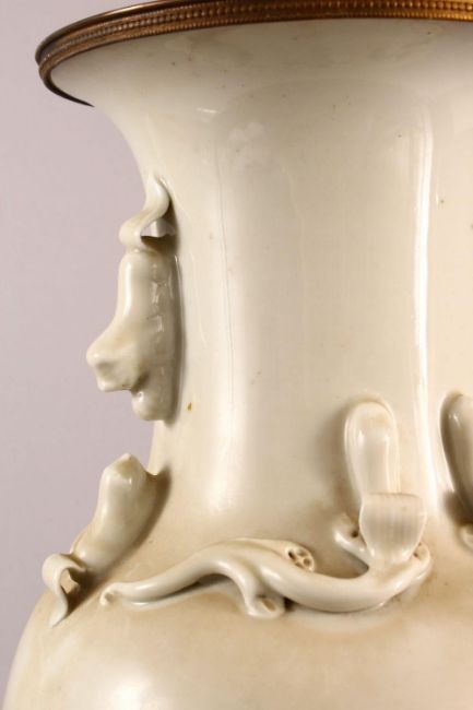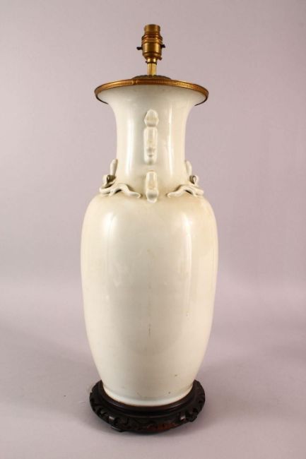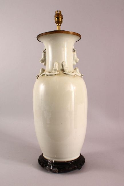 A LARGE CHINESE MONOCHROME PORCELAIN TWIN HANDLE VASE / LAMP, the lamp with a monotone colour, moulded lion dog and kylin in the canton style, mounted as a vase with a wooden stand, 60cm
