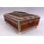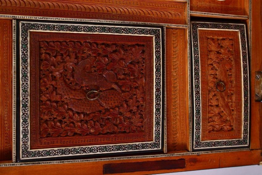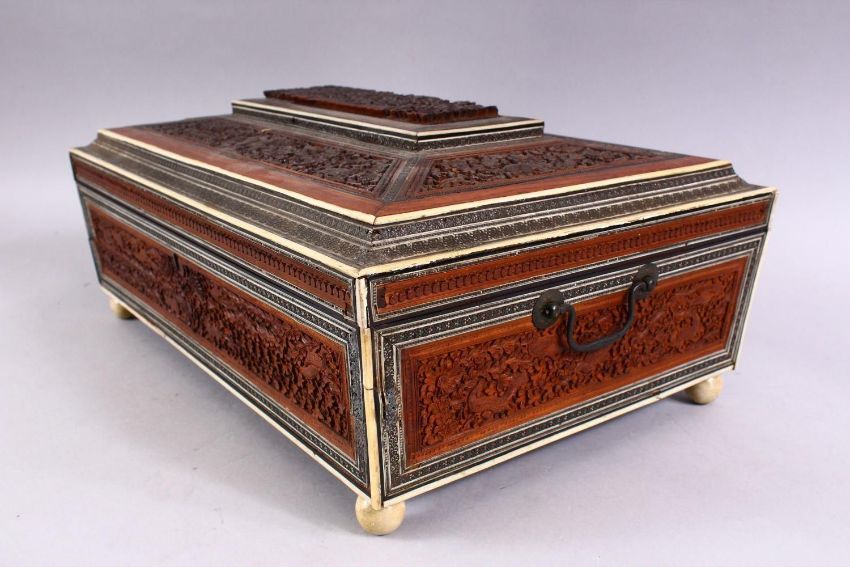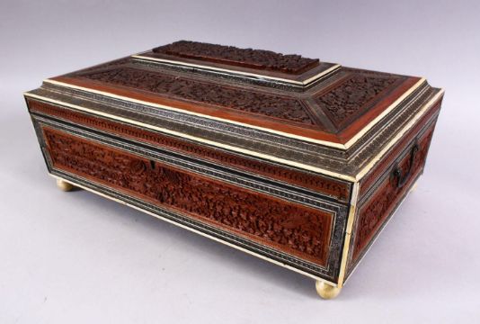 A 19TH CENTURY ANGLO INDIAN INLAID LIDDED SEWING BOX, with carved wood depicting figures and animals amongst foliage, with micro mosaic inlay with ivory banding, the interior with ivory implements and carved wooden boxes, on four carved ball feet, 45cm wide x 30cm deep x 19cm high.