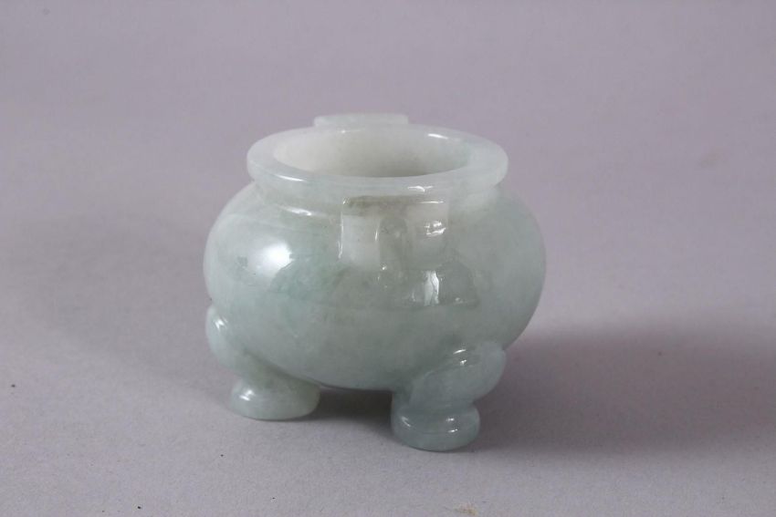 A MINIATURE CARVED TWO HANDLED JADITE CENSER, 5cm diameter.