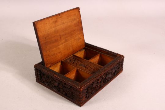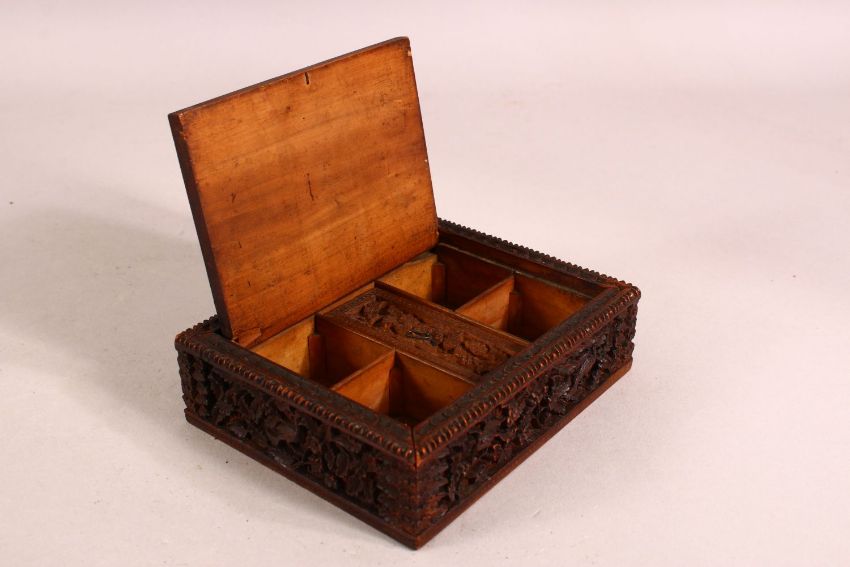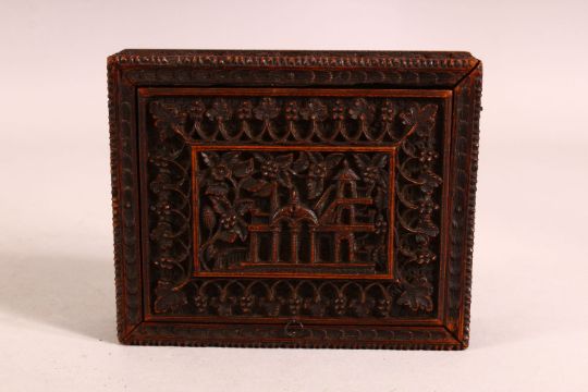 A 19TH / 20TH CENTURY INDIAN CARVED WOODEN BOX - the box with a removable lid revealing storage compartment, the body carved in deep relief depicting buildings and foliage. 14cm x 11cm