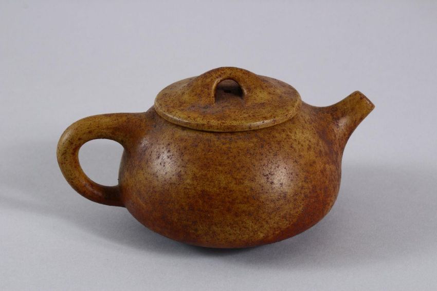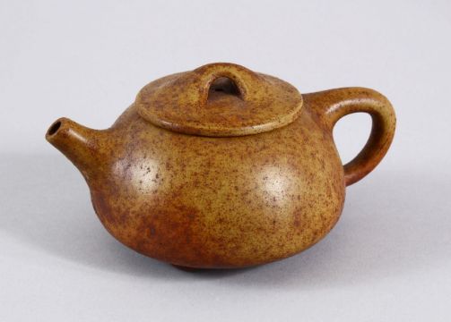 AN UNUSUAL CHINESE YIXING TEAPOT, with marks to inner lid and impressed seal mark to base, 16cm at widest point, 8.5cm high.