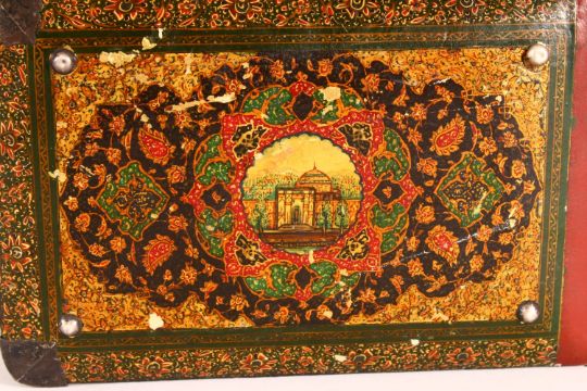 A PERSIAN LACQUER, WHITE METAL & ENAMEL ARTIST BOOK - the cover with in inset enamel plaque of a landscape, held by white metal carved mounts upon a painted lacquer cover, interior with pages and page protectors, 24cm x 14cm