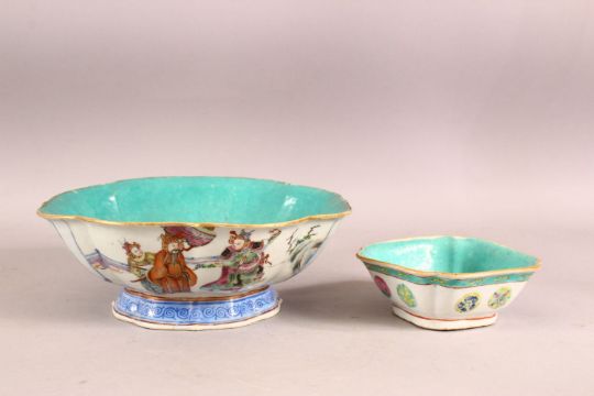 TWO 19TH CENTUYR CHINESE FAMILLE ROSE PORCELAIN BOWLS - The larger decorated with scenes of figures in garden settings, the interior with a turquoise ground, the base with an iron red seal mark, 24cm, together with a similar style smaller porcelain bowl, 12cm (2)
