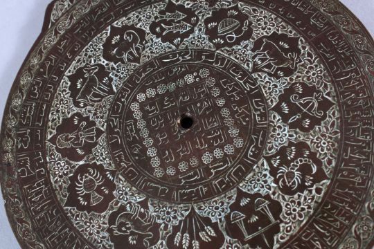 A 18TH/19TH CENTURY PERSIAN QAJAR BRONZE ASTROLABE BODY, 22.5cm x 16cm.