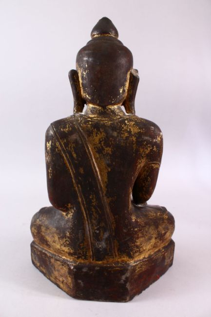 A FINE EARLY STONE THAI SEATED BUDDHA, in Bhumisparsha Mudra pose, with traces of red lacquer and gilding, 46cm x 29cm. From an important estate.