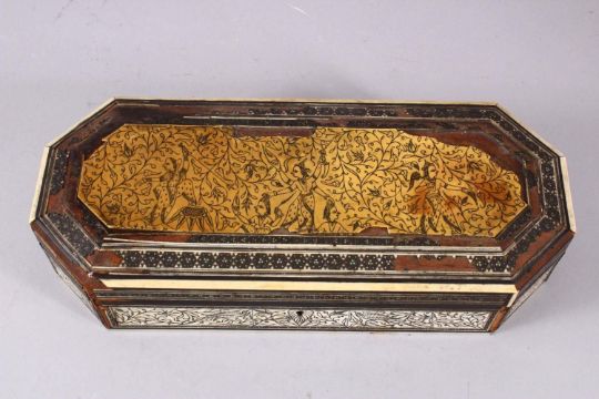 AN 18TH CENTURY INDIAN GOA INLAID IVORY LIDDED BOX, the box with a top ivory inlaid slither carved with figures and flora, further decorated with carved ivory panels and micro mosaic inlay, 31cm wide x 13cm deep.