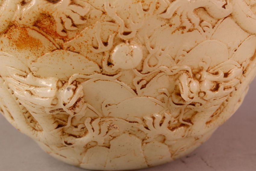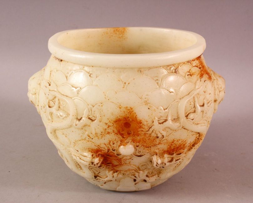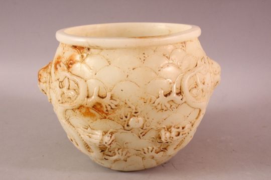 A CARVED HETIAN JADE TWIN HANDLED BOWL, the body carved with dragons, 14cm high, 19cm diameter.