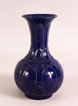 A CHINESE BLUE GLAZED PORCELAIN MOULDED VASE - 17.5cm high.