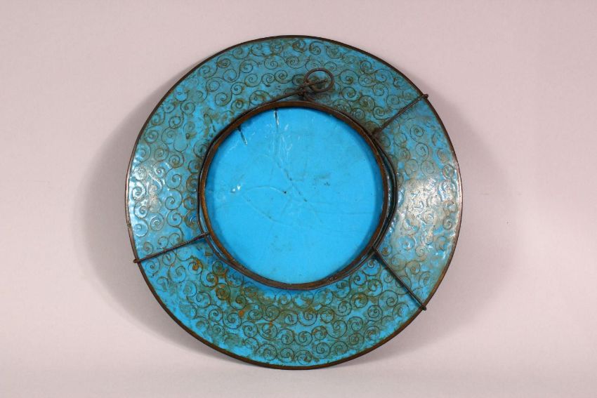 A JAPANESE CLOISONNE DISH, decorated with cranes and flowers, 30cm diameter.